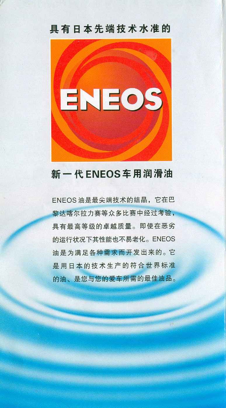1,名称:ENEOS(中文译名:亿能新).是日本最大的石油公司的产品,是日本最大的品牌,是全球十大润滑油品牌之一.与丰田,本田,日产,三菱四大日本汽车品牌是全球合作伙伴.是这些汽车的原装装车机油.