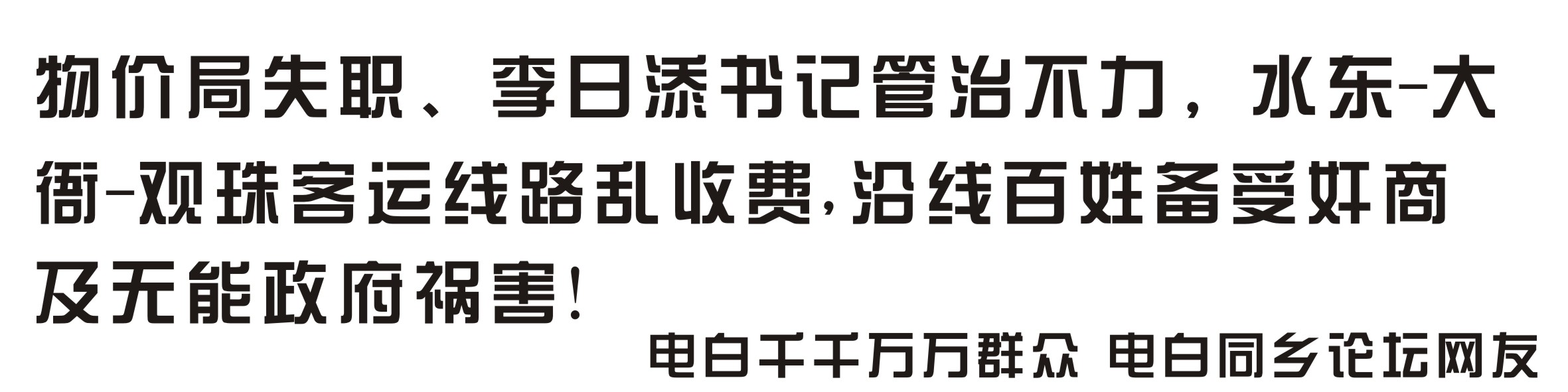 QUOTE(byronroy @ 2009年10月07日 Wednesday, 12:52 AM) 假期在家乡愕然发现水东-华楼/大衙-观珠线路车无视电白物价局规定进行乱收费,物价局无视群众举报,李日添书记有管治不力之嫌。 电白县物价局失职:该线路车收费奇高且不执行物价局制定价格,恶行没有得到制止。 李日添书记无能:群众多次反映并投诉得不到跟进和处理,书记管治不力 物价局制定的价格表上标明:“水东-大衙”段收费5.5元 而该段实际车费收8元,并且售票员毫无顾忌扬言:物价局的规定是傻的,你们(乘客)要坐就坐,不坐就下车,爱投诉就投诉去。 [snapback]2860750[/snapback] 此事的不果,只证明一样东西:电白相关主要领导李日添书记、丁锦文县长及物价局长没有执政能力、同时也无法秉公执法!因为我所列是铁的事实!