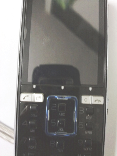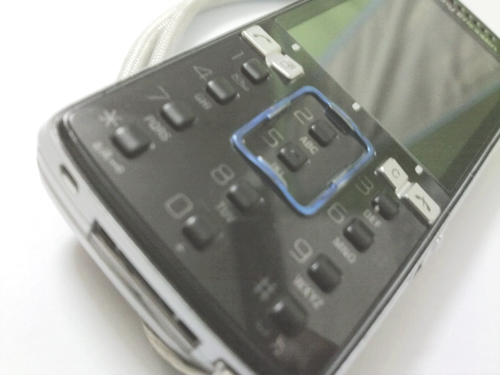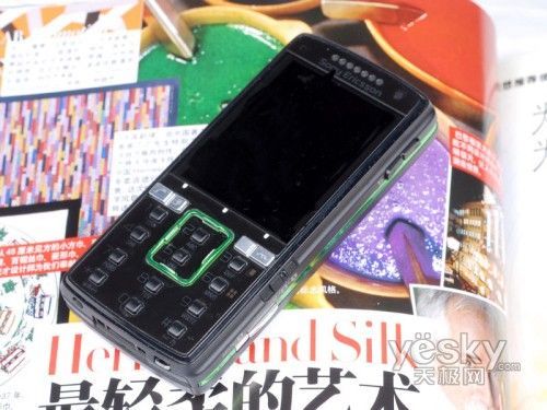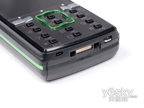 令人称奇的是K850的导航键,设计师将其框入到数字键盘内,非常有个性。为有效区分数字按键,导航键设计成线状的长方形体,图中的绿色方框即为该机的导航键。导航键突出于机身面板表面,方便用户准确定位,然而限于细条状外形设计,操作手感并不太舒适。从导航键的设计上,我们可以发现该机并没有设置确定键,但是一款不具有确定按键的手机在操作中的不便是可想而知的,相信索爱不会出现这样的设计疏忽。那么这一确定按键到底是如何设置的呢?细心的朋友可以发现在功能键的上方有三个白点,这就是确定键的藏身之处。这三个按键采用触控式设计,灵敏度非常高。而且在按压下去时会有绿色指示灯亮起,非常漂亮。