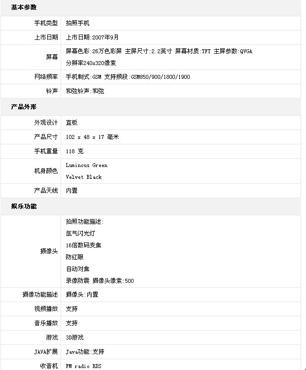 索尼爱立信K850采用索爱最拿手的直板式造型设计,机身线条笔直硬朗,酷劲十足。尤其是采用黑色为主色调,更增强了它的视觉冲击力。在色彩搭配选择上,除了经典的黑色外,该机的功能键、镜头部分和LOGO标签都是采用银色点缀,再配上眩目的绿色方向导航键和机身周边装饰条,魅力无限,非常惹眼。较之于前辈产品,该机的尺寸稍有放大,达到了102×48×17mm,感觉偏厚,但是内部安置了500万像素的摄像头,可谓厚也厚得值得。机体重量为118克,握在手中没有半点轻浮感,在便携性和握持质感上找到了上佳的平衡点。
