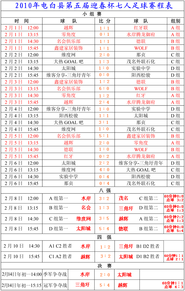 路虎 初中三年级 注册 2009-06-03 消息 523 反馈评分 0 点数 0 2010-02-16 #63 2010年第五届迎春杯七人足球赛全部赛果 部分赛果来源只是道听途说,未经组委会证实,如有记录错误,敬请见谅! [attachmentid=232116] 附件 2010第五届“电白人”迎春杯足球赛-赛程表.PNG 278.2 KB · 查看: 590