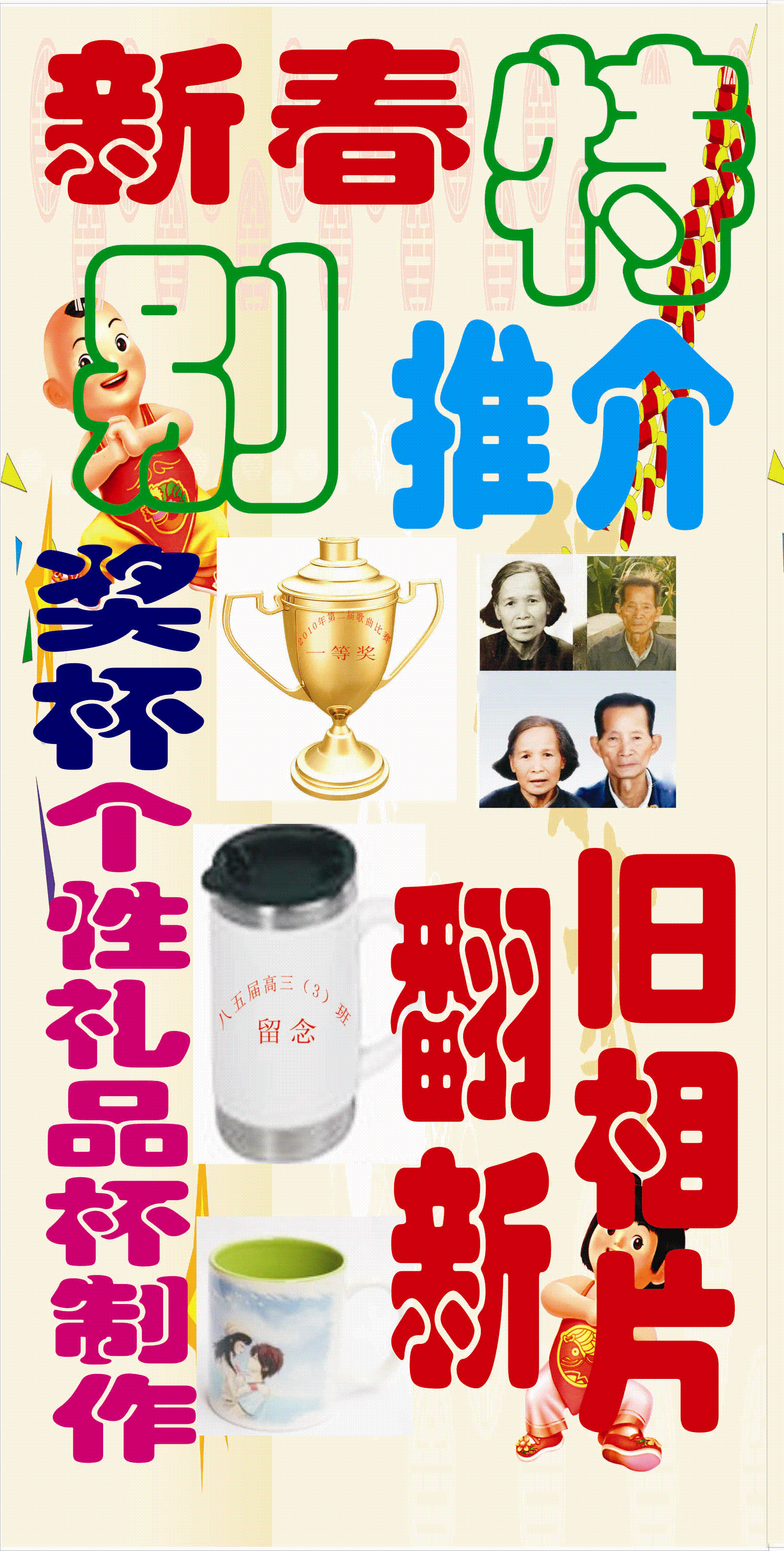 5、在年初一到十五期间,在杯、笔、书包等小物件上制作有个性图案一个2元,纪念册、卡制作印刷一律八折。