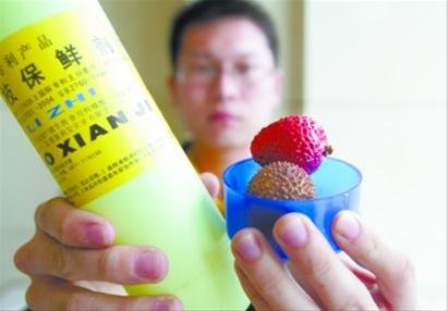 “荔枝喷上保鲜剂,1个小时后,荔枝果皮鲜艳的光泽,生意卖得火!”卖保鲜剂的人这样吆喝着。