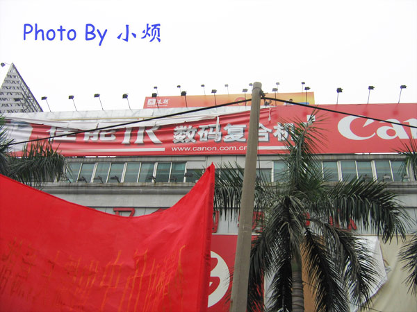 队伍一直在岗顶的附近喊着口号,并拆着日货的招牌.大家大声的喊着口号,渲泄着自己的爱国热情.首先是南方电脑城的索尼专卖店,然后是好又多楼顶的佳能广告牌.接着是太平洋一期的爱普生,富士通等,就连一期对面十几层楼高的NEC手机广告牌也有不怕危险的勇士爬上去,拆掉!