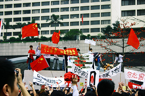 在中信门口,我们停了下来,在带头人的指示下,我们没有进入中信,大家群集在中信门外,唱着国歌,高喊着口号...何钓,抵日,统台等...能想到的口号都喊了出来!全体人在中信门外宣誓,以后不用日货.后来,我们被武警们围住了,还好没有再次发生冲突.警察和军队的领导也走到我们中间,劝阻我们,后来经过协商,我们的带头人决定唱完最后一次国歌后大家和平解散.我们要求和武警们出要陪我们一起唱,但一直到最后都没有成功,或许他们在执行任务,不可以这样做吧.最这样,我们唱完最后一次国歌后和平散去.