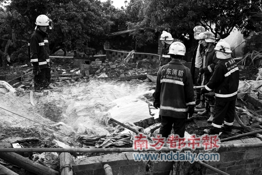 发生爆炸的是一间面积约200平方米的红砖房子,已被炸成废墟。消防员正在往废墟喷水,并搬开杂物作更细致的搜寻。从现场情况来看,用来做堆放火药等材料及制作炮竹的几间相连的房间的屋顶、墙体均已被炸毁,仅剩下墙脚和断掉的竹木。用来作卧室的另一排房间还算完好,屋内垂着两顶蚊帐。整个作坊地面堆积着炮竹碎纸及断墙、砖块,部分地面塌陷,围墙倒塌,铁栅门脱落在屋外。该房子四周种有许多龙眼树,旁边有几间低矮的草棚,棚顶正有明火在燃烧。