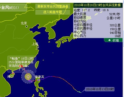 20日晚上11时,超强台风“鲇鱼”中心位于北纬18点6度、东经117点2度,也就是在汕尾市东南偏南方约500公里的南海东北部海面上,中心附近最大风力16级,达到每秒52米的风速,中心最低气压940百帕,8级大风范围半径约350公里。
