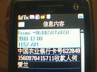 QUOTE(专顶好帖 @ 2010年12月08日 Wednesday, 07:42 PM) 只听到电话看不到人,银行账户是外地的。此人应该不是外省的,有可能是电白本地人,说不定是个生佬。 [snapback]3067700[/snapback] 又换了一个电话催我汇款 18658456171 听口音不是本地人