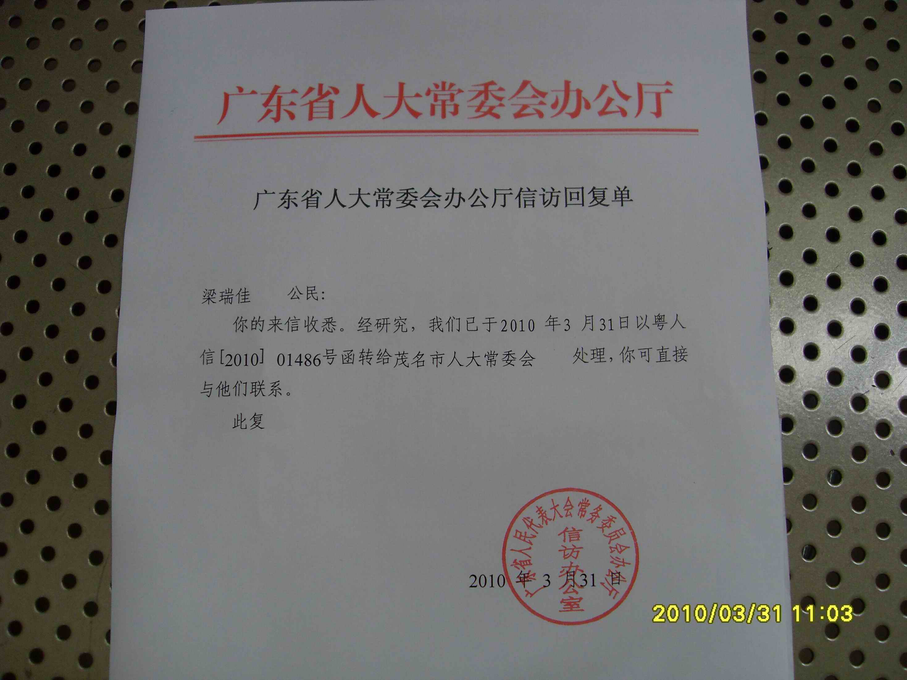 上访控告人梁瑞佳,男,汉族,五十七岁,住广东省电白县观珠镇江下村委会鸡母山村,农民。