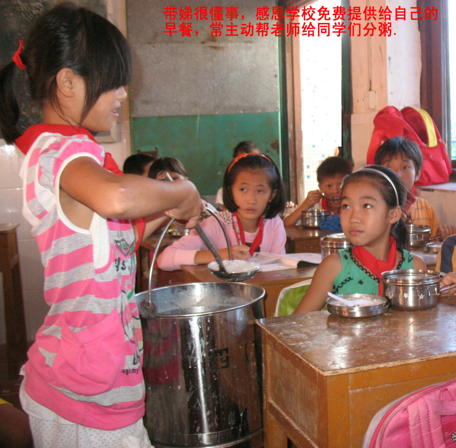 • 带娣很懂事,感恩学校免费提供给自己的早餐,常主动帮老师给同学们分粥_副本.JPG