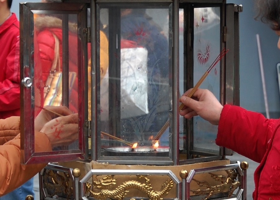 西关大屋二楼神台的祭器和对联:宝鼎呈祥香结彩,银台报喜烛生花。