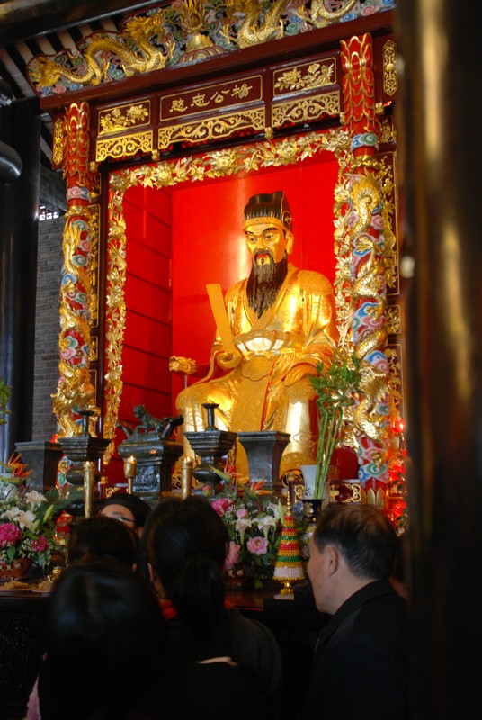 西关大屋二楼神台的祭器和对联:台报喜烛生花,鼎呈祥香结彩