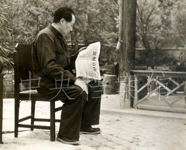 毛泽东看有关南京解放的报纸。