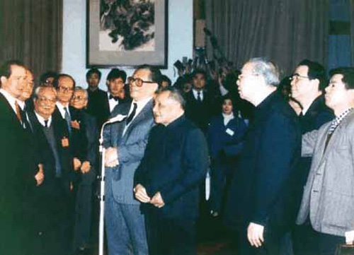 1990年2月邓小平与江泽民等同志会见出席中华人民共和国香港特别行政区基本法起草委员会第九次全体会议的委员