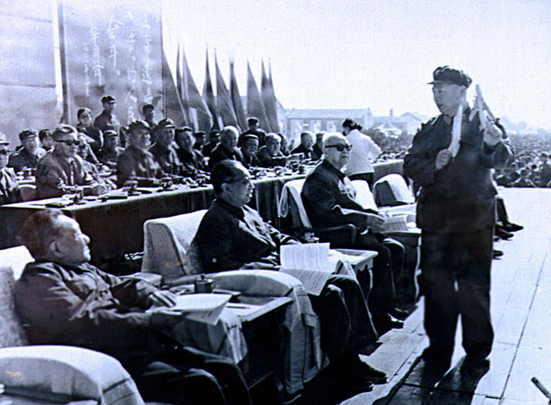 1978年,空军司令员张廷发向邓小平、华国锋、叶剑英等中央领导介绍飞行表演情况。