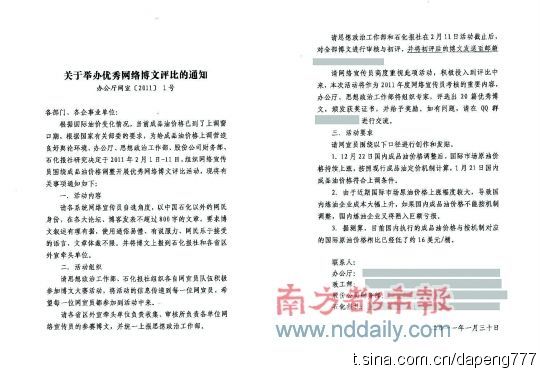 2月10日,网友孙海峰在自己的微博上和文化中国网站上发布了一篇文章《垄断企业也有五毛党》,内容是一份中国石油化工集团公司办公厅《关于举办优秀网络博文评比的通知》,通知称“请各单位网络宣传员自选角度,以石化以外网民的身份,在各大论坛、博客发表不超过800字的文章。”11日,孙海峰再次在微博上曝光该通知,不过这一次是通知的扫描件。通知称,成品油价格已到了上调窗口期,根据国家有关部委的要求,为给成品油价格上调营造良好的舆论环境,举办该评比活动。这个通知在微博上被曝光,引发热议。(凤凰网2月13日)