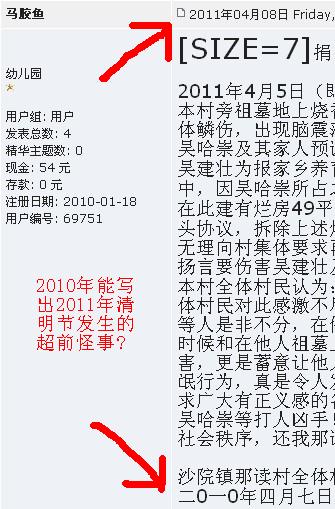 关于该文由“马胶鱼”发表于本论坛(另还发布在凤凰网某论坛,已查实列于本帖末尾),在文章的落款处签署者是乌有的:“沙院镇那读村全体村民”,署名时间是2010年4月7日,发表时间是2011年4月8日。全文围绕2011年4月5日(即清明节)而写。现附该文截图,如下: