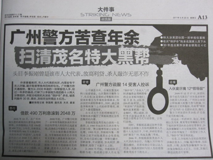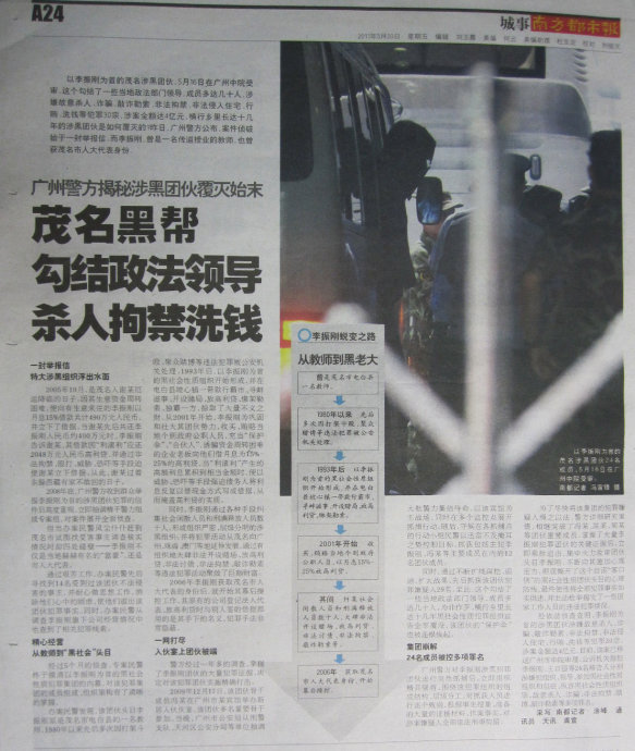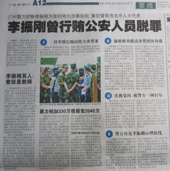 以李振刚为首的茂名涉黑团伙,5月16日在广州中院受审。这个勾结了一些当地政法部门领导,成员多达几十人,涉嫌故意杀人、诈骗、敲诈勒索、非法拘禁、非法侵入住宅、行贿、洗钱等犯罪30宗,涉案金额达4亿元,横行乡里长达十几年的涉黑团伙是如何覆灭的?昨日,广州警方公布,案件侦破始于一封举报信。而李振刚,曾是一名传道授业的教师,也曾获茂名市人大代表身份。