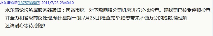 水东湾论坛已经备案了。这次停网应该是全国性的吧,包括我经常去逛的口琴、吉他论坛都上不了――不过,今天都可以上了,水东湾论坛还上不了。