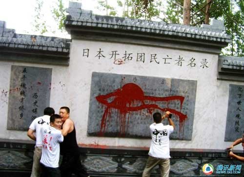 据“湘军五百”介绍,昨天下午,他们一行5人带着小铁锤和两小桶红油漆到达中日友好园林,发现现场有警察看守,便绕道四五公里,从山后翻越一道墙、两道铁丝网才得以进入公墓区域。躲开现场守护的8名人员后,他们抡起小铁锤欲将碑身砸毁,无奈碑身十分结实,倾尽全力只砸出一些小坑。见状,他们索性举起红油漆,朝石碑两面泼去,估计碑体受染面积约30%。
