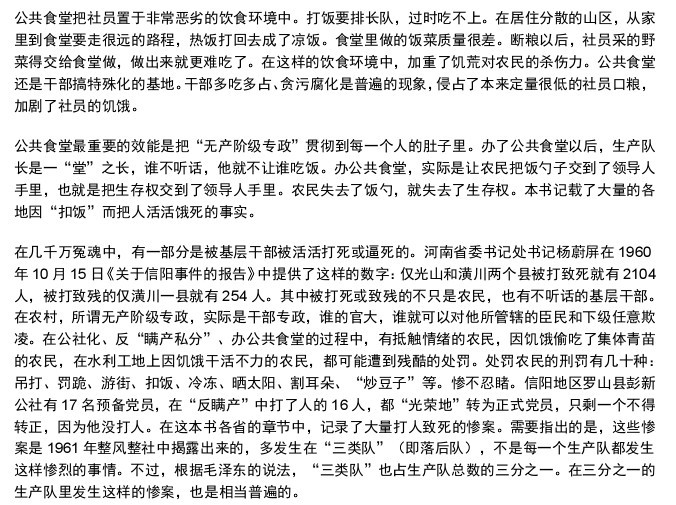 按照最保守的计算,在1958年至1961年,信阳的800万人口中有100万死亡。在多年之后,余还收到警告让他不要提及此事。但是他以自己的名字写了一份详细的报告,交给了当地的党书记。他说,“有些人问我,‘你承认了的所做的错事还不够多吗?如果官方的历史中没有包括这些材料,那么我的个人历史中要包括。我有资料证实我的话。’”那时,信阳通常都会丰收,不像河南,常常被称为“乞丐省”,历史上就是贫瘠和饥荒之地。但是这个城市的所有优势都因统治官员而丧失殆尽。那个时候,河南和信阳都被要效忠于毛的极左思想所笼罩,而毛只从激烈的阶级斗争的角度来看待粮食产量问题。余还能生动地记得1959