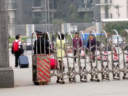 当记者来到位于犀浦镇的成都外国语学校大门口,看到校门口正陆续有学生和老师从铁门处走出,无一例外的是每个学生身后都拖着大包行李,校门口有门卫对出入人员进行严格检查,并严厉禁止媒体记者进入学校。
