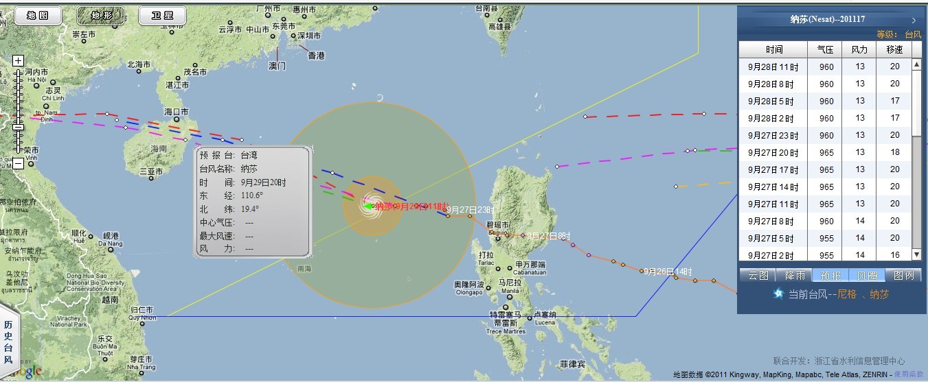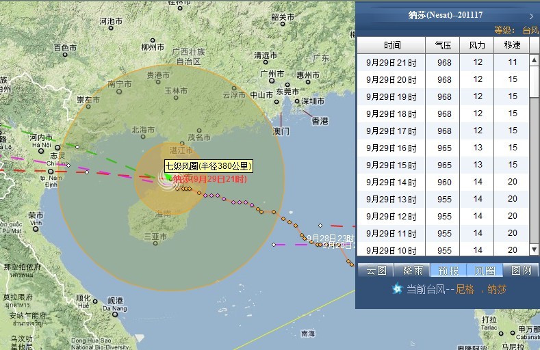 2011年第17号台风,09月28日12时位于北纬17.4°、东经116.3°,最大风速40m/s,中心气压960hPa “纳沙”的中心9月28日11时位于海南省文昌东偏南方大约655公里的南海东部海面上,将继续向西偏北方向移动,强度将有所加强,并逐渐向广东西部到海南东部一带沿海靠近。
