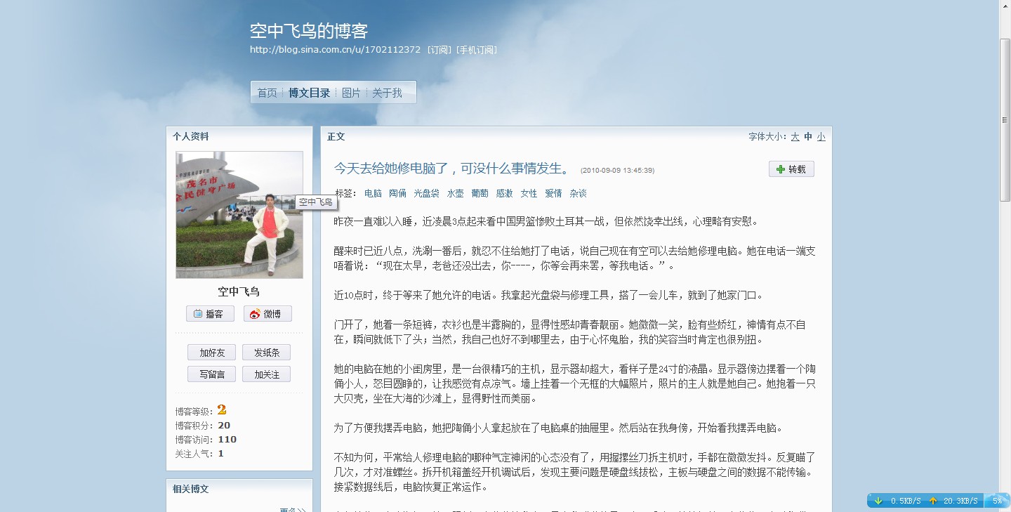 醒来时已近八点,洗涮一番后,就忍不住给她打了电话,说自己现在有空可以去给她修理电脑。她在电话一端支唔着说:“现在太早,老爸还没出去,你----,你等会再来罢,等我电话。”。