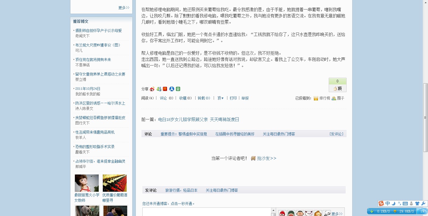 在帮她修理电脑期间,她还买来葡萄给我吃。令我感激的是,由于手脏,拿不了葡萄。她就提着一串葡萄,噻到我嘴边,让我咬几颗。除了默默的看我修电脑,喂我吃葡萄之外,我与她没有更多的言语交流。在我有意无意地瞄她几眼时,窥探到她细小的睫毛之下,哪双眼睛有些累。