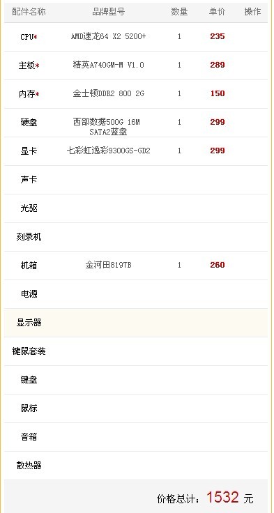 配置:主板 精英A740G,内存2GB,CPU AMD X2 5200,硬盘 西数500G,显卡 七彩虹9300GS,机箱带电源。老板人好心,还免费送给我一套光电鼠标键盘的套装。