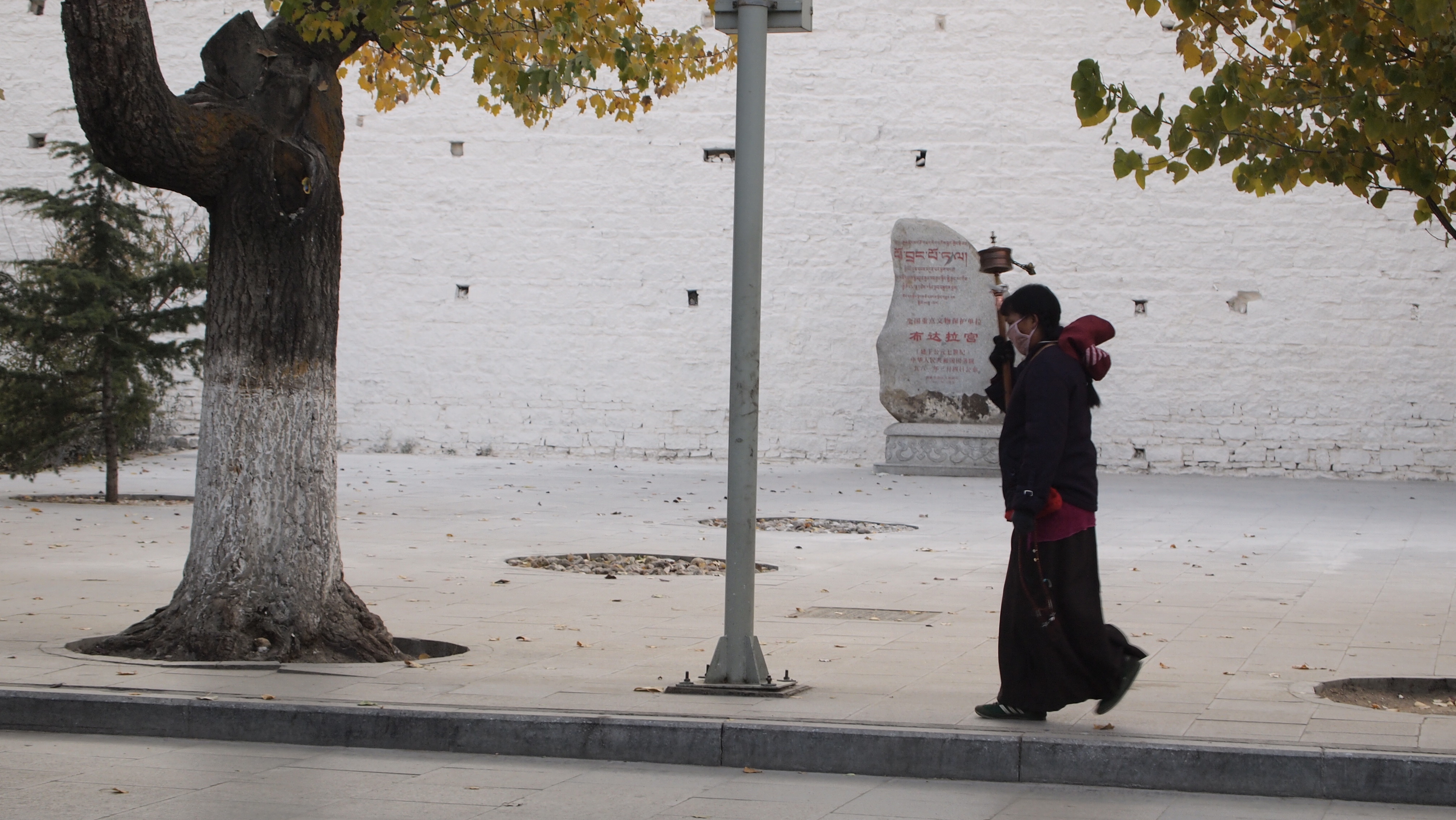 在布达拉宫旁边转着经轮的藏民。