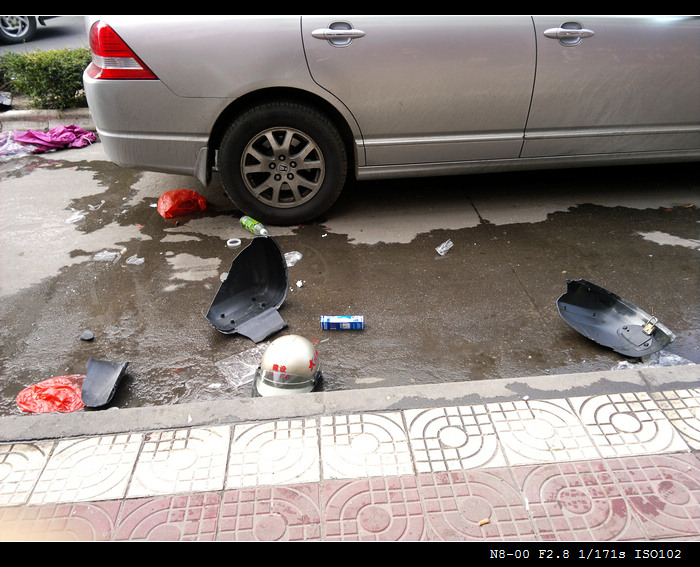 摩托车壳被碰拦,到处都是。