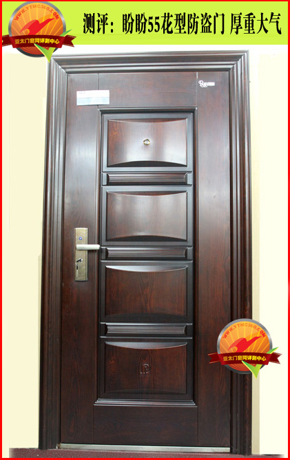 这款防盗安全门,边框大,厚重大气;采用镀锌钢板防腐蚀,表面木纹逼真清晰,美观大方;门锁采用先进的防盗锁,门锁上安装有门铃,设计巧妙,电池安装也方便;门框边装有包安装带磁性胶条,关闭门时不会发出刺耳的金属碰撞声;门上焊接点可见不明显;
