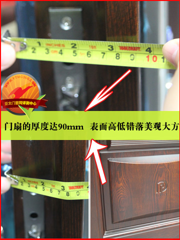 这款防盗门门扇厚度为90mm厚重大方。采用木纹饰面,表面为镀锌钢板。整款门呈现红木色调。表面高低错落、框型美观大方、有较强的立体感。钢板采用镀锌钢板,厚度为1.5CM,门框钢板厚度为2.0cm,重量约为200斤左右,门框和门扇料厚均符合国家标准GB17565-2007,钢板质量良好,达到国家标准。