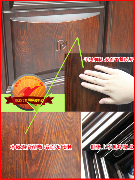 纹路清晰,门面逼真,手感光滑细腻,表面平整度好。框体上没有任何焊接不见,防止框受热变形,具有保温、隔热性能。门板是镀锌板,具有防腐性能,表面漆面无气泡,色泽均匀。