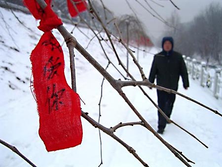 2004年12月17日,圣诞节前的这几天,在吉林市的松花江畔,一对情侣用红丝带系在树上,上爱写着对方的名字和我爱你的字样,开始是一个男子为他心爱的女友写的,后来他的女友也用上千红丝带写上对方的名字系在旁边的树上示爱,这引来不少市民前来观看!都对这对情侣的示爱方式感到钦佩!