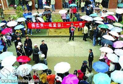 风雨中,一名西装革履的小伙子手持玫瑰,背后拉一条长约8米横幅:“韩××,我爱你!一生一世!李×”。武汉某高校女生公寓楼前,一名男生的另类示爱行动引来数百名学生围观。