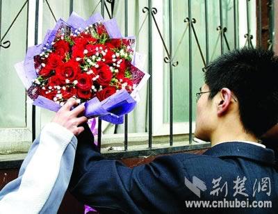 风雨中,一名西装革履的小伙子手持玫瑰,背后拉一条长约8米横幅:“珊,我爱你!一生一世!鸿×”。武汉某高校女生公寓楼前,一名男生的另类示爱行动引来数百名学生围观。