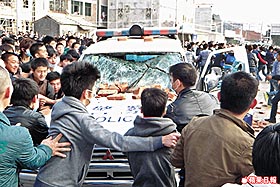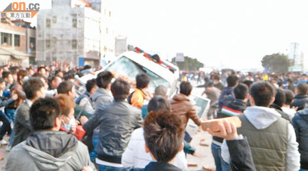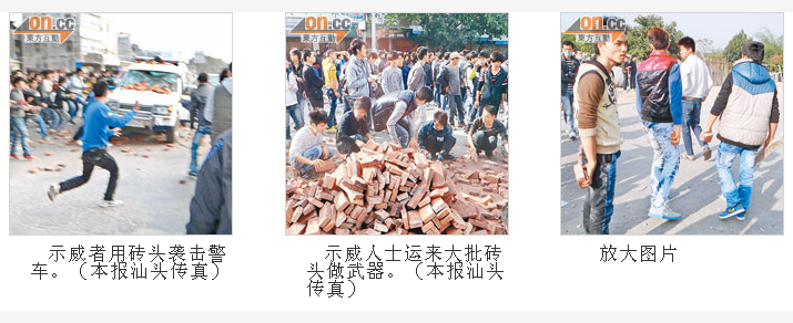 海门镇青年:今天还在闹,第4天了,都集聚在深汕高速路口,有好几万人啊。我们海门镇的人口就有十几万,一大半都出动了。因为前三天他们抓了我们好多人,就是不肯放。今天我们最主要的目的是要求他们放人。武警部队全部都出动了,抓人啊。今天早上不知道是被炸伤还是什么,好几个人(被)炸的头破血流。他们全副武装。