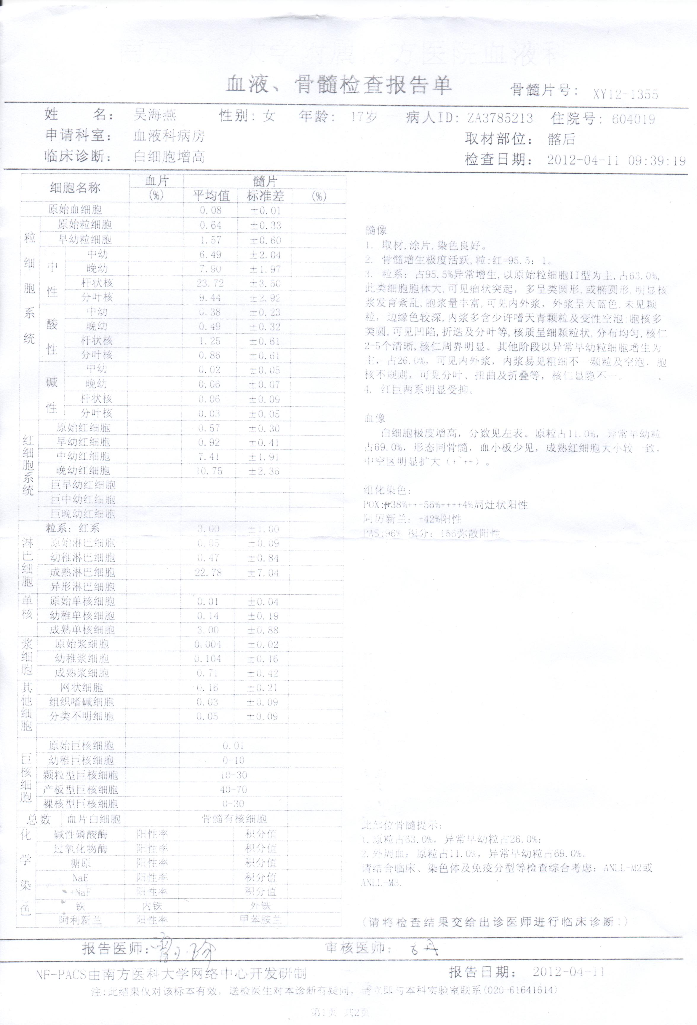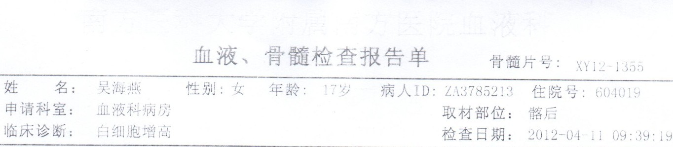 吴海燕治疗的医院:广州市南方医院内科楼13楼血液科72床,