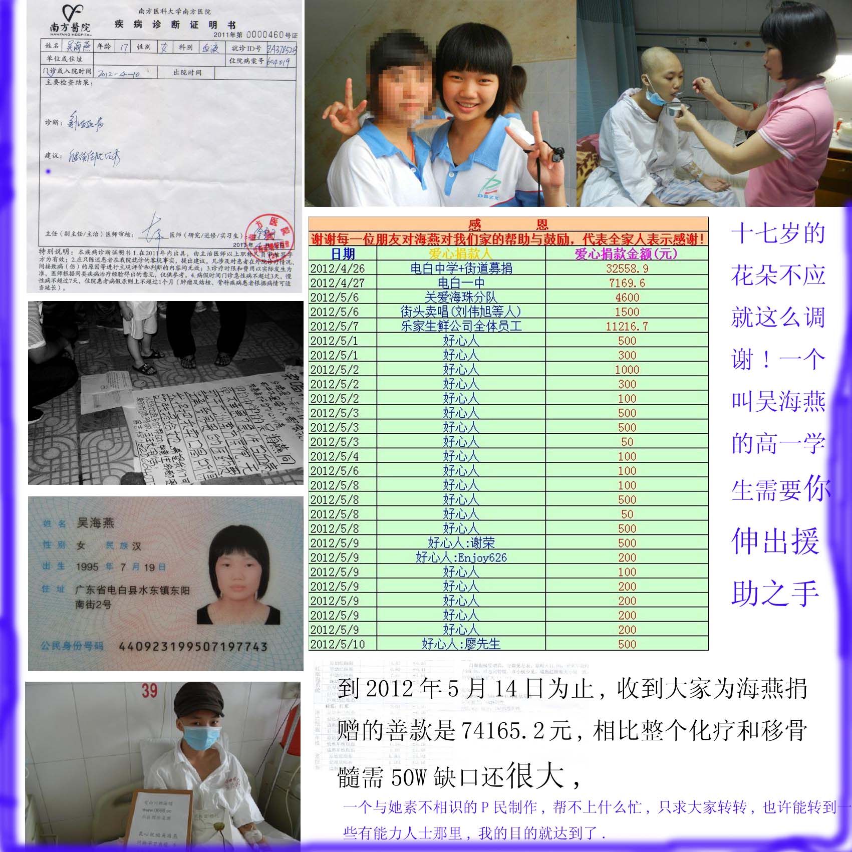 昨晚上家乡论坛时看到这个贴子时很有感触,现在的医疗制度一旦碰上大病,不但会耗光全家人的资源,还会透支全家人的将来,17岁的花朵不应就这样被这个冷漠的社会所摧毁吧,具有同情心的人还是居多数,只是大家的同情心被一些社会不良事件压制了下来,刚才也通过网银转账略表了一点心意,钱多少不关重要,但我觉得更重要的是把这个事转发出去,让更多更有能力人士伸出相援之手.我一会也制作一个WEIBO在我那转发一下,人多力量大,你们也要充满信息.温总不是说了嘛,信心比金子还珍贵.当民承受不起重大疾病之重时,拦驾视察民情的温总总会引起一些拍马屁之流的地方官员重视而得到解决,但这样的幸运者比中六合彩还难,所以还是靠广大有善心的伸出相援之手更为现实.