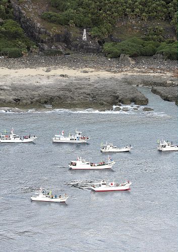 法新社报道,抵达钓鱼岛附近海域的日本“慰灵团”中今天早上已有9名日本人登上钓鱼岛。8月18日,日本150名右翼人士由冲绳石垣岛出发,乘坐21艘船赴钓鱼岛海域进行“慰灵”活动,据了解其中还包括8名日本国会议员。图为8月18日,21艘日本渔船在钓鱼岛周围航行。