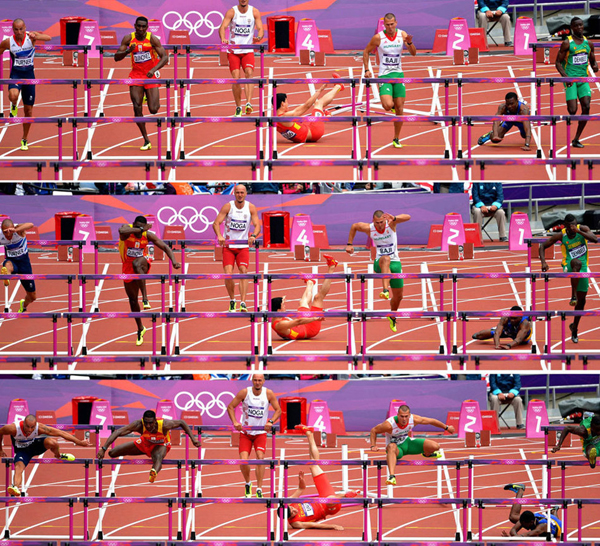 8月7日,在伦敦奥运会男子110米栏预赛中,刘翔未能跨过第一个栏架摔倒,受伤退场。在许多国人为刘翔的“受伤”担忧摸泪时,被刘翔称为好朋友的美国名将梅里特在赛后就评论:“赛前我并不觉得他受伤了,他在热身区状态很好,一切看上去都没问题。我觉得他只是犯了个技术性失误,他距离栏架太近了。他撞到了栏架上。这种事情发生之后是很难在重新回到比赛中的。”