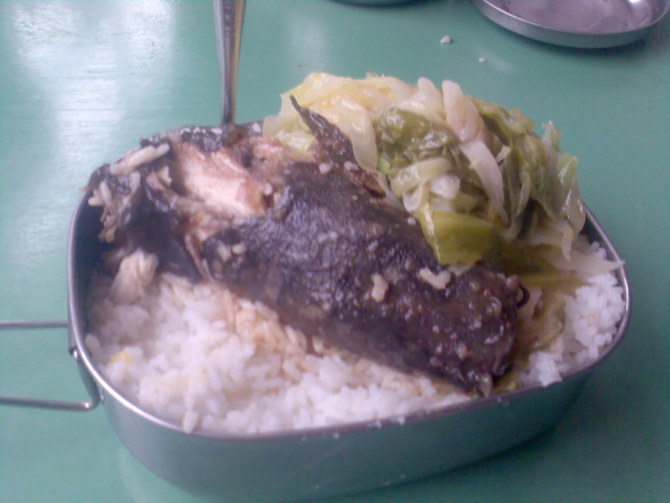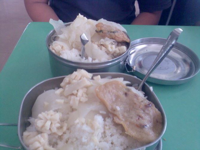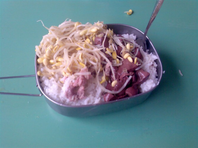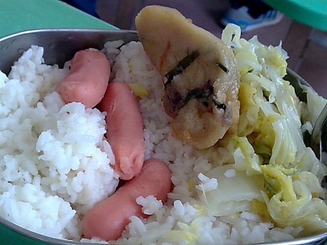 呵呵,我读书时是自带饭盒,自己把米和水,或者萝卜干或者番薯芋头放在饭盒里一起蒸。学校当时没有统一买菜做饭来售卖。