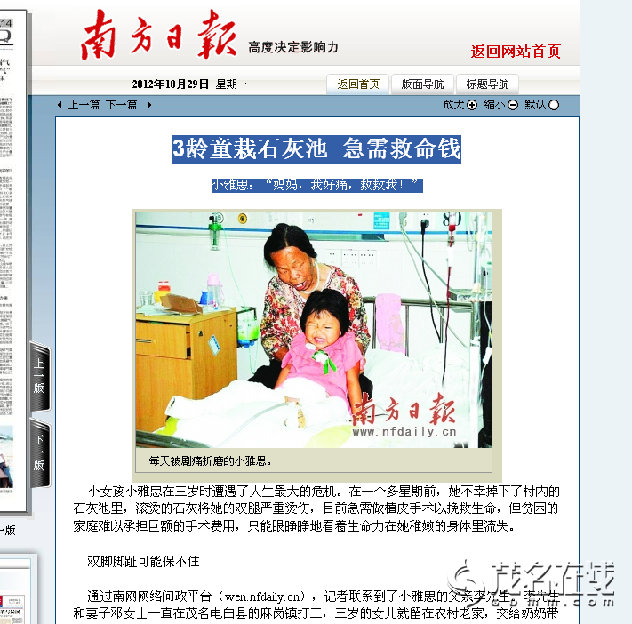 byronroy . 荣誉会员 注册 2005-08-17 消息 70,153 反馈评分 356 点数 191 2012-10-30 #52 昨日,《南方日报》报道了3岁的电白女孩小雅思不慎掉入石灰池,双腿被严重烫伤,亟需尽快接受植皮手术一事;报道同时于南网网络问政平台发布,小雅思的不幸遭遇受到了网友的广泛关注。 热心的网友在微博上不断扩散消息,传递爱心。小雅思的家属告诉记者,昨天还有一些网友志愿者自发前往茂名市人民医院看望小雅思。 许多爱心网友给小雅思的妈妈邓女士的账号上汇去了爱心捐款。记者昨日联系到小雅思的母亲邓女士,她感动地告诉记者,昨日小雅思共收到了3万元左右的捐款,邓女士托南方日报记者向爱心网友表示真诚的感谢。 目前,小雅思的手术费还有7万多元的缺口,小雅思只能在医院继续接受输液和敷药等简单治疗。而离小雅思的最佳治疗时机只剩下2天。广东有爱,网络有情,小雅思的命运需要我们共同伸手援助。 南方日报记者 李秀婷 实习生 冯俊程 援助热线: 15915263843(邓女士) 邓女士的邮政储蓄账号:62218859 23001897197 户名:邓晓霞