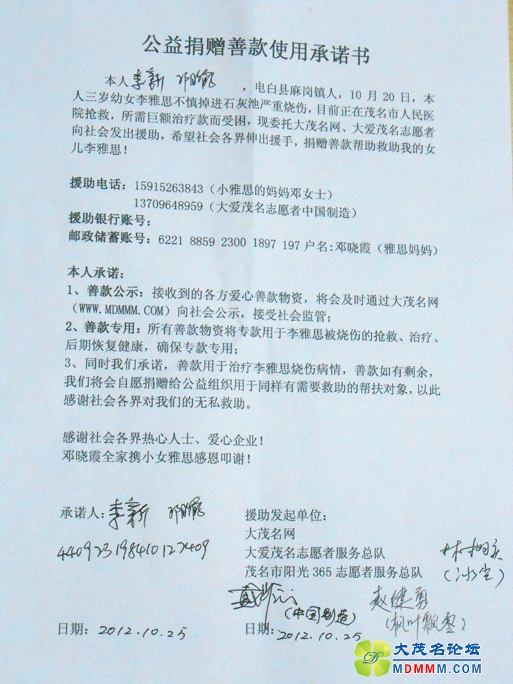 下午14:30时,在特护病房忙着护理工作的小雅思妈妈-邓晓霞女士致电委托大茂名网感恩所有关注、帮助援助小雅思烧伤的社会各界,目前捐赠款已达到223400元。小雅思的初期手术工作已经启动,将在下周择日手术。同时,并将严格履行求助之时的善款使用承诺。确保善款的公开,正确使用。如有盈余,将捐赠社会公益帮助他人回馈社会对其的帮助! [attachmentid=302292] [attachmentid=302293]