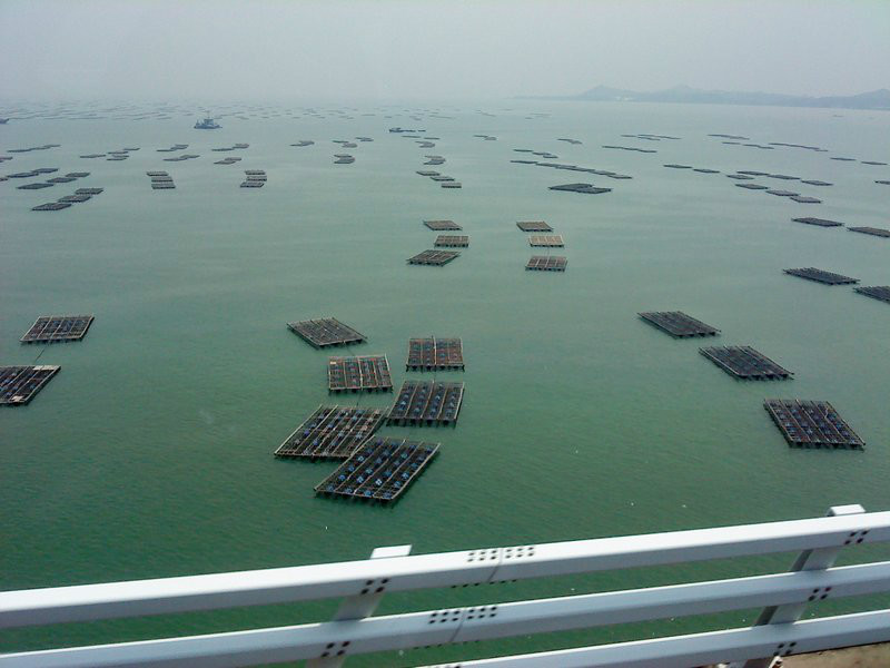 桥下香港一端的流浮山海域很多养蚝排,连绵数里.