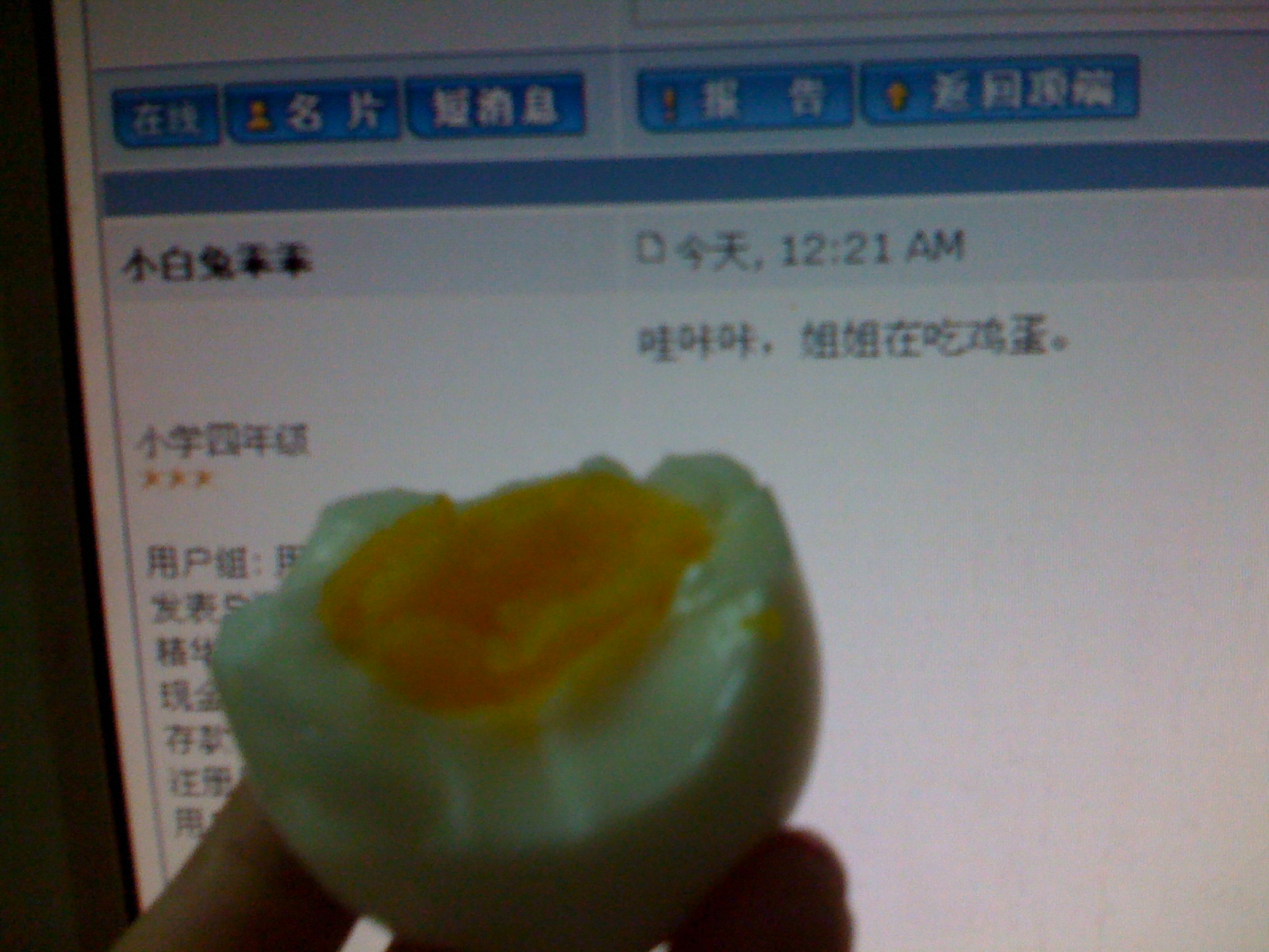 小 小白兔乖乖 大学三年级 注册 2012-11-22 消息 821 反馈评分 0 点数 1 2012-12-23 #52 哇咔咔,姐姐在吃鸡蛋。 附件 IMG_0307.jpg 579.4 KB · 查看: 321