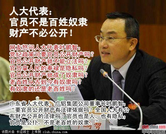 广东省人大代表、广铝集团公司董事长叶鹏智在广东省人大十一届一次会议预备会议上追问:“要官员公开财产有法律依据吗?全国人大有公布财产公开的法律吗?官员也是人,也有隐私;官员是公仆,不是老百姓的奴隶”。
