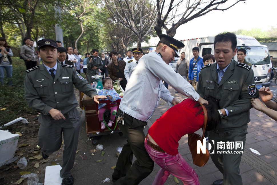 2013年3月6日15时40分,广州大道南靠近客村立交处,城管执法试图赶走一带着小孩的女小贩。双方发生口角后,突然一名制服编号X080324的城管执法人员上去掐住女小贩脖子意图将其放倒。随后,小贩老公到场,发现妻子被警方强行扣押上警车,要求城管下车给出说法,对方不予理睬。南都记者 黎湛均 摄